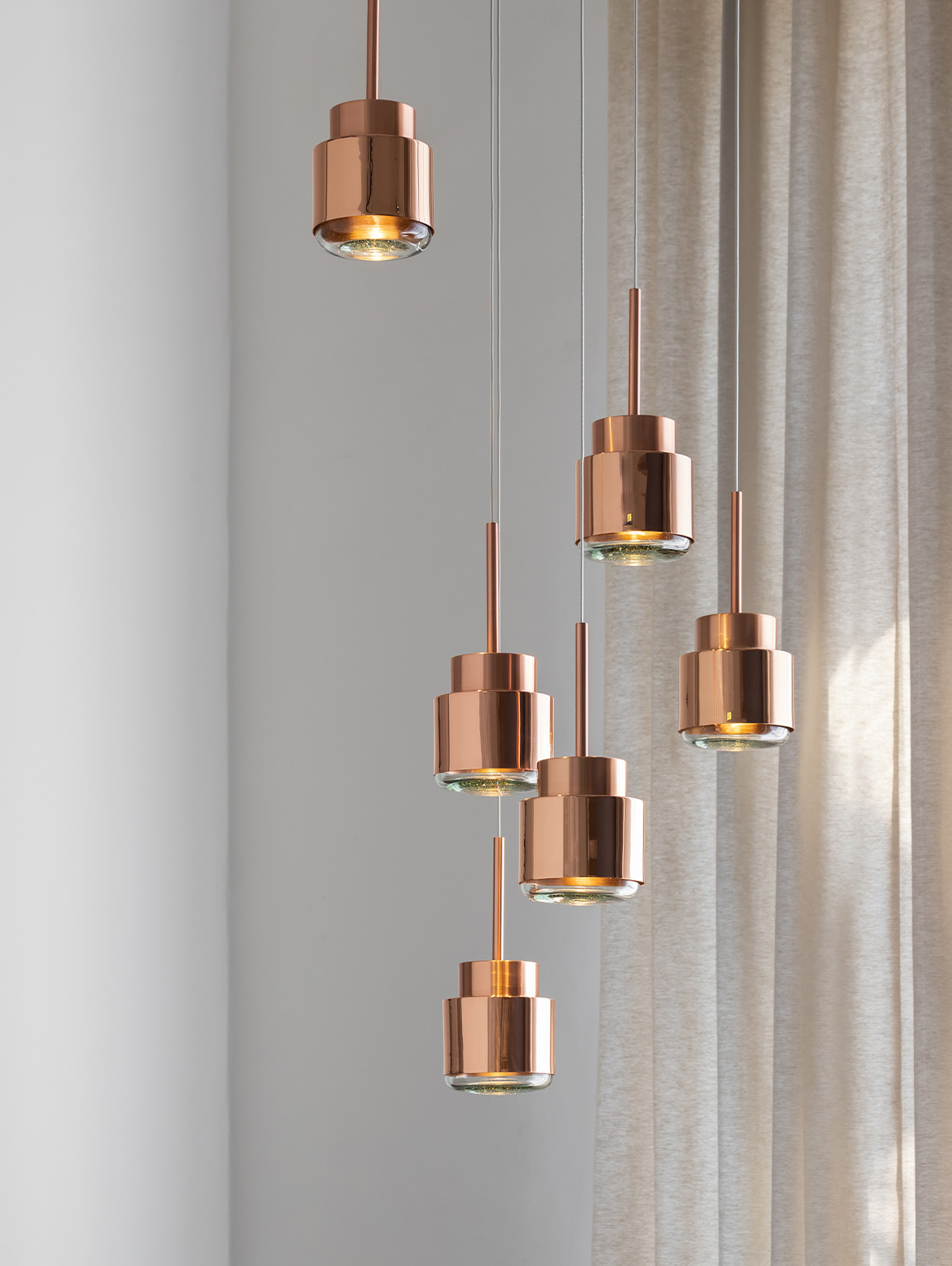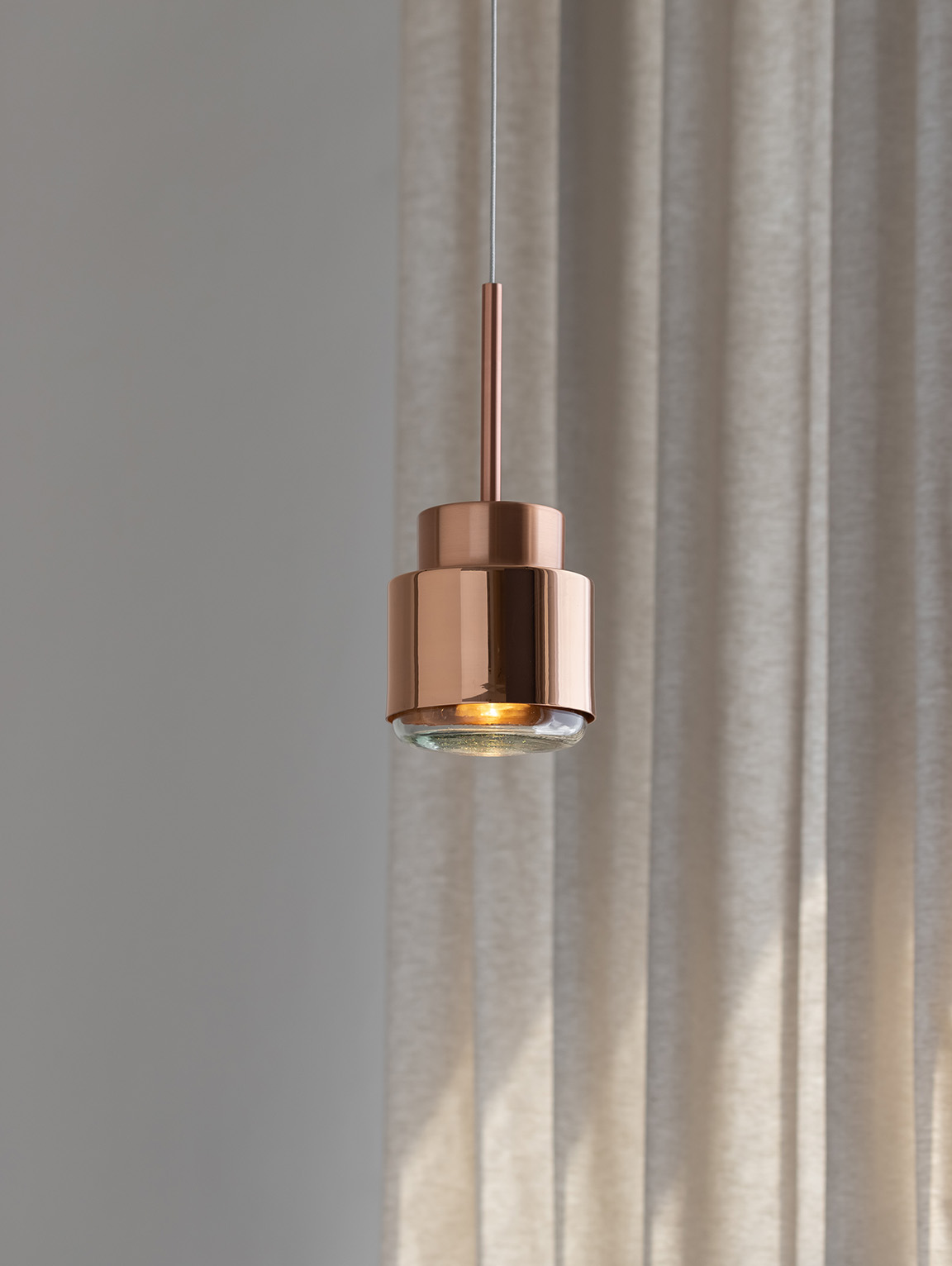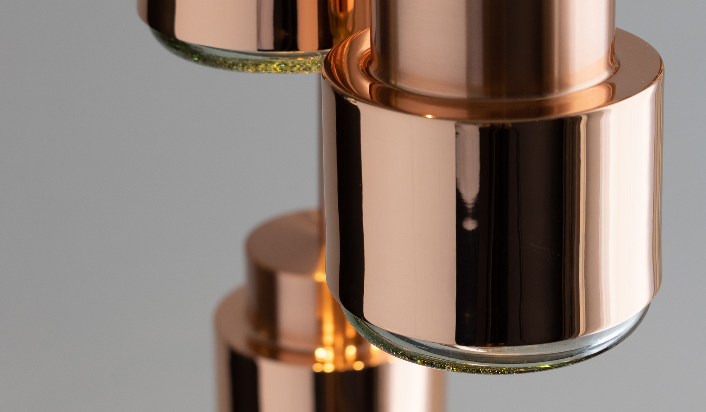 Materiales cobre macizo y vidrio soplado 100% reciclado. Diseñada por Studio David pompa. Dimensiones 28.5cm de largo x 13cm de diámetro. Peso 1k.