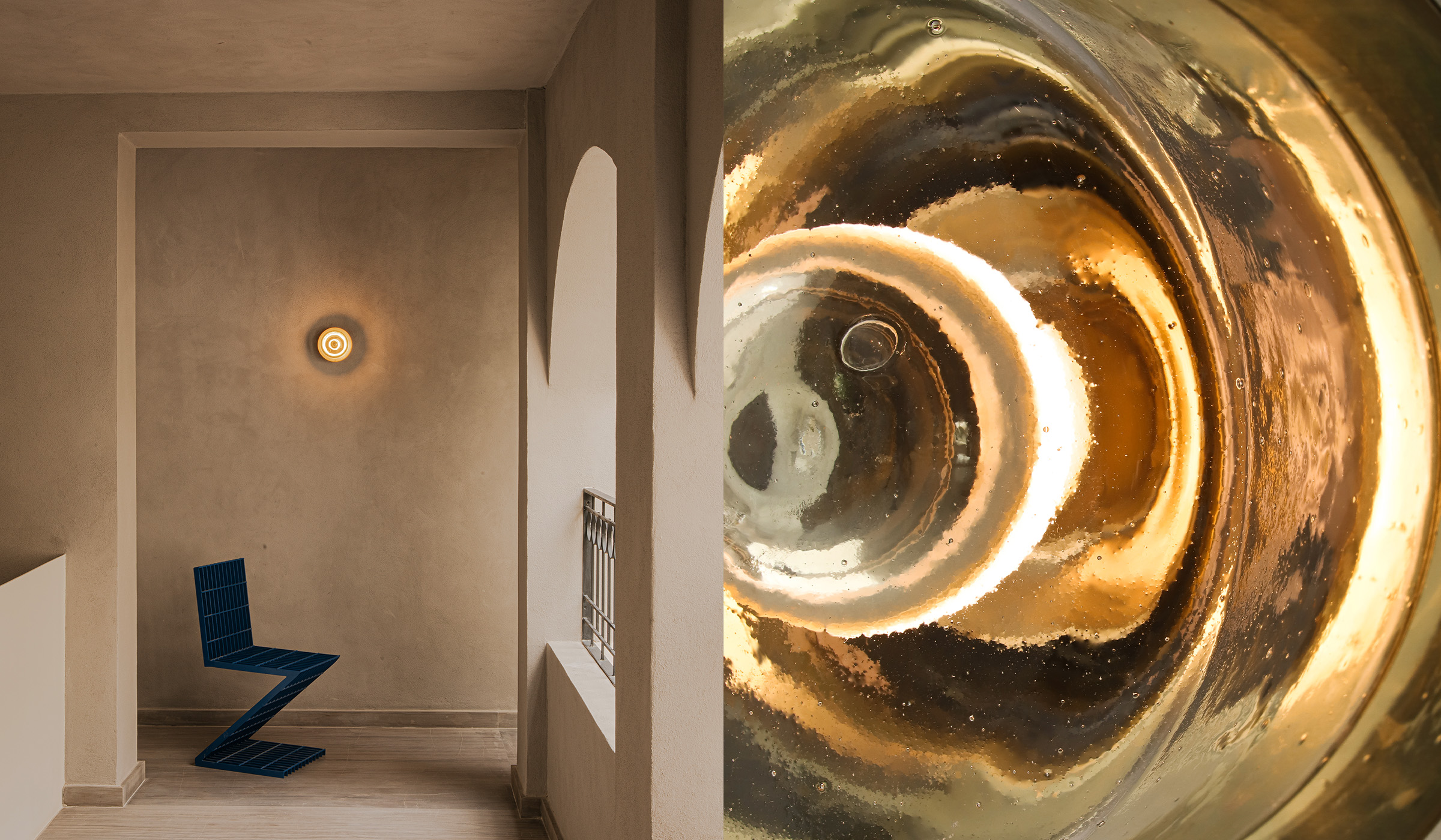 Materiales Latón macizo y vidrio soplado 100% reciclado. Diseñada por Studio David pompa. Medidas 13.5cm de largo x 15cm de diámetro. Peso 1kg