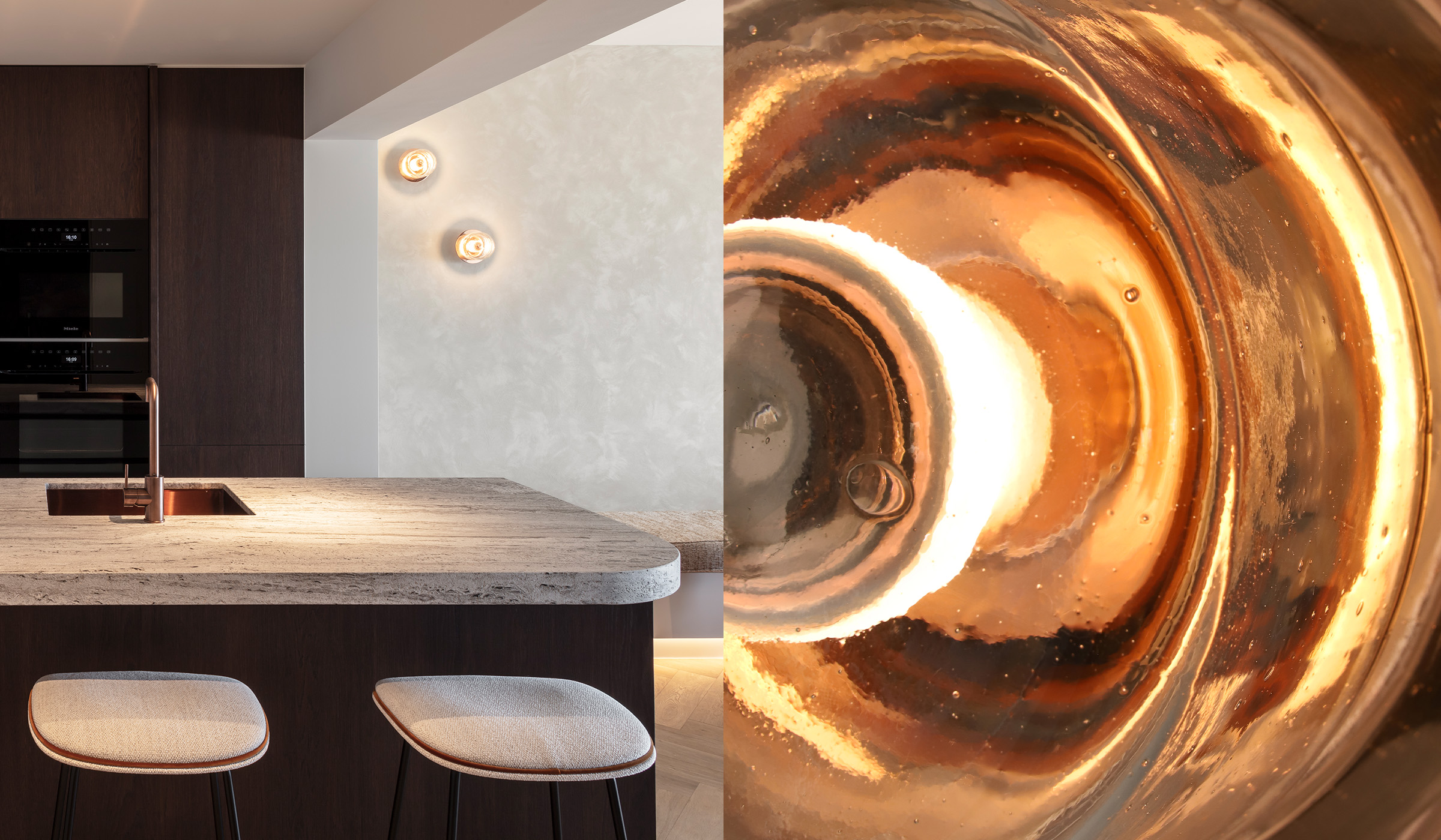 Materiales cobre macizo y vidrio soplado 100% reciclado. Diseñada por Studio David pompa. Medidas 13.5cm de largo x 15cm de diámetro. Peso 1kg.
