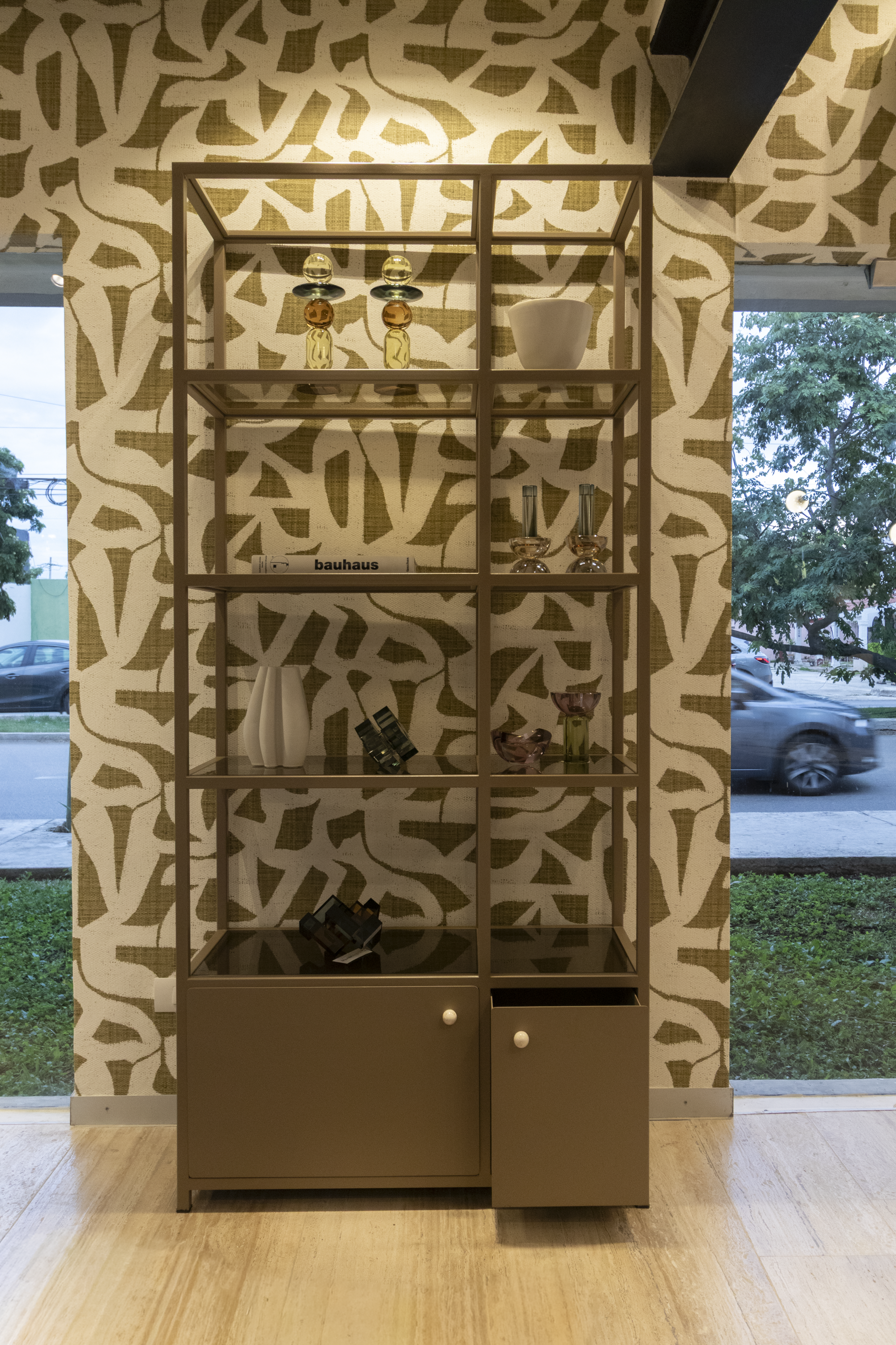 Estantería Lucia llena tu espacio con un sutil diseño que enmarca objetos de exhibición, mientras otorga almacenamiento oculto y abierto. Completamente en armazón de metal del color de su preferencia y vidrio translúcido en cada repisa que crean espacios horizontales por todo el mueble. Nota: Las dimensiones pueden variar ±1 a 2 cm por procesos de fabricación y adaptación al diseño.