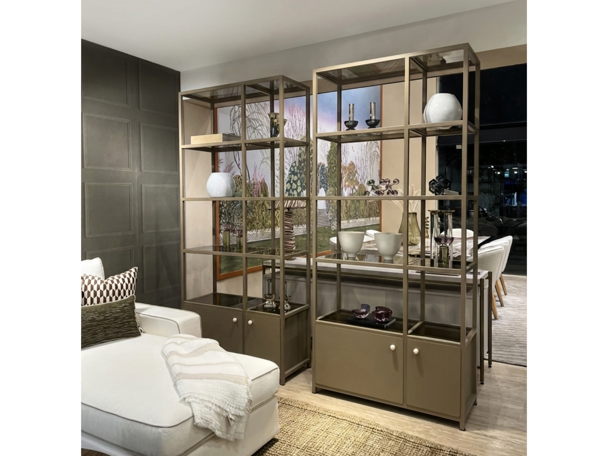 Estantería Lucia llena tu espacio con un sutil diseño que enmarca objetos de exhibición, mientras otorga almacenamiento oculto y abierto. Completamente en armazón de metal del color de su preferencia y vidrio translúcido en cada repisa que crean espacios horizontales por todo el mueble. Con opción de cajones o puertas por la parte inferior. Nota: Las dimensiones pueden variar ±1 a 2 cm por procesos de fabricación y adaptación al diseño.