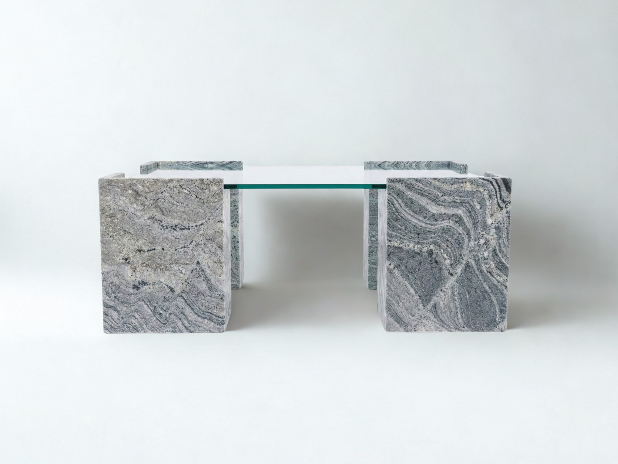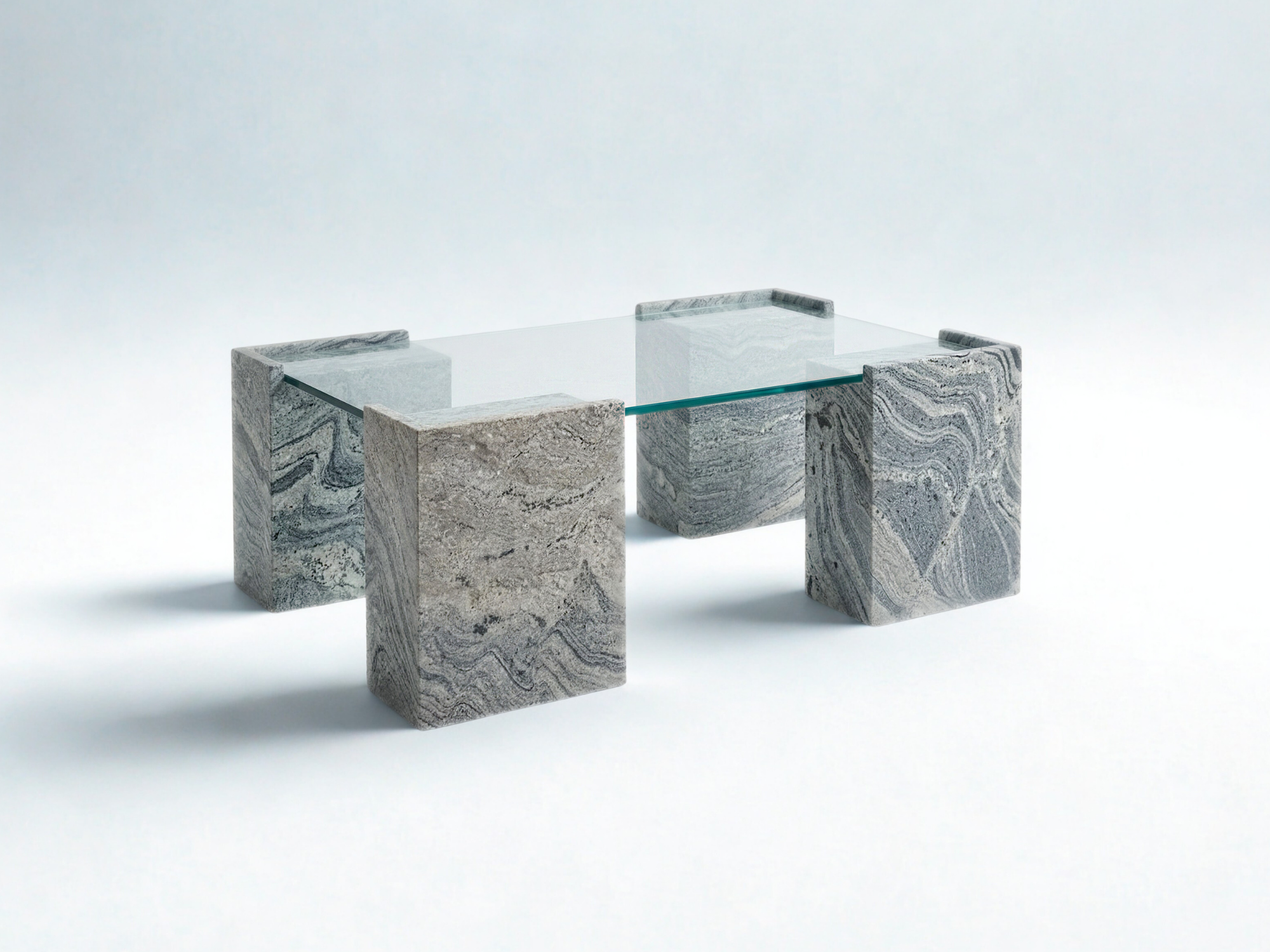 Estructura de patas de mármol con cubierta de cristal templado de 12 mm.