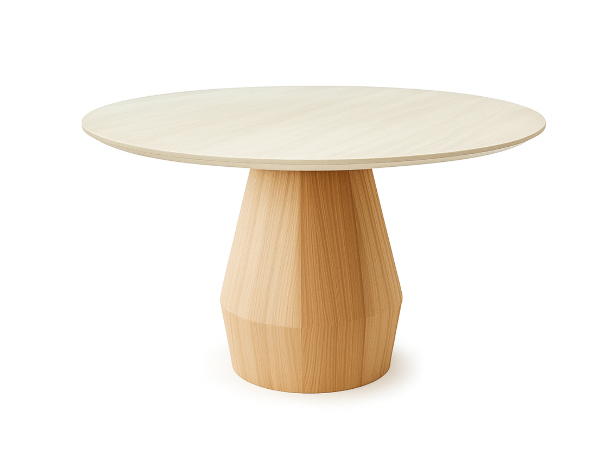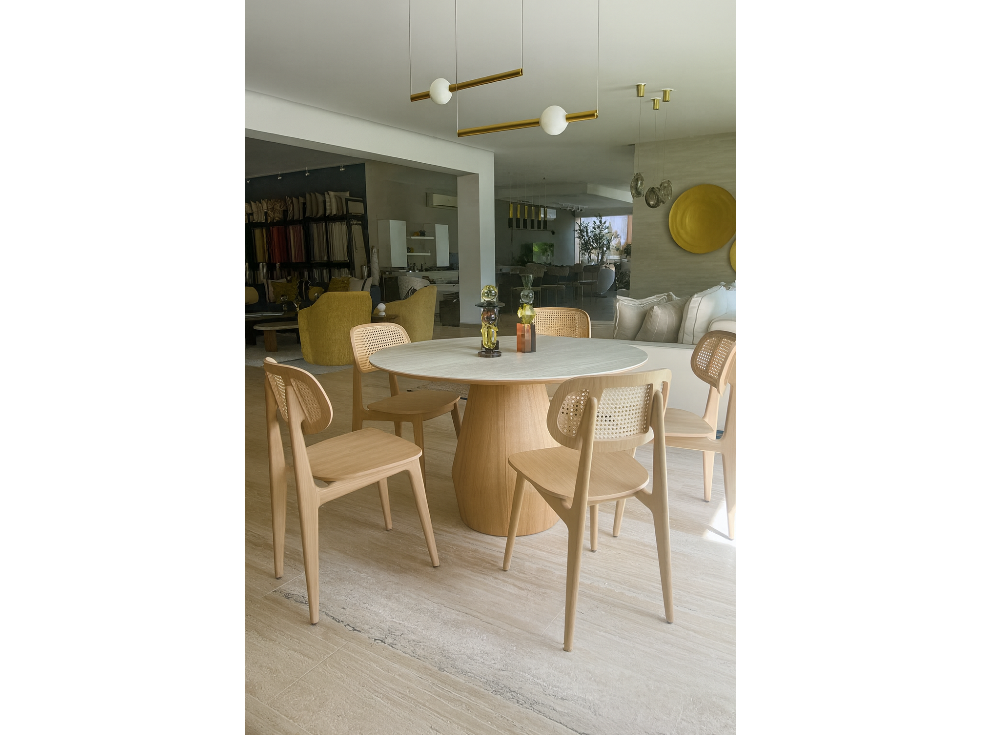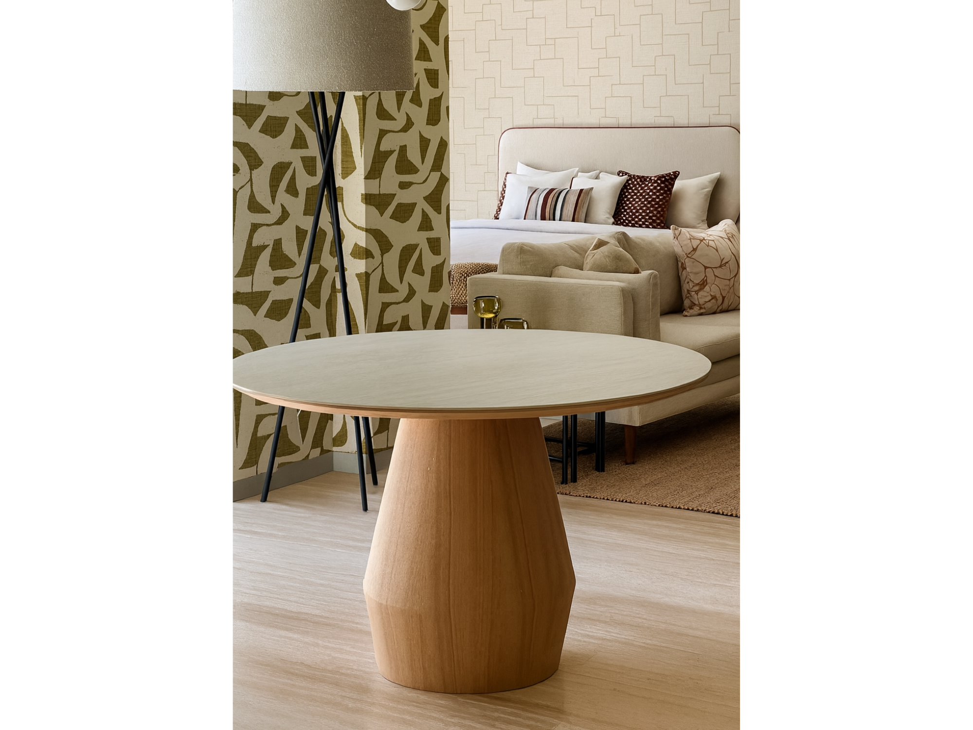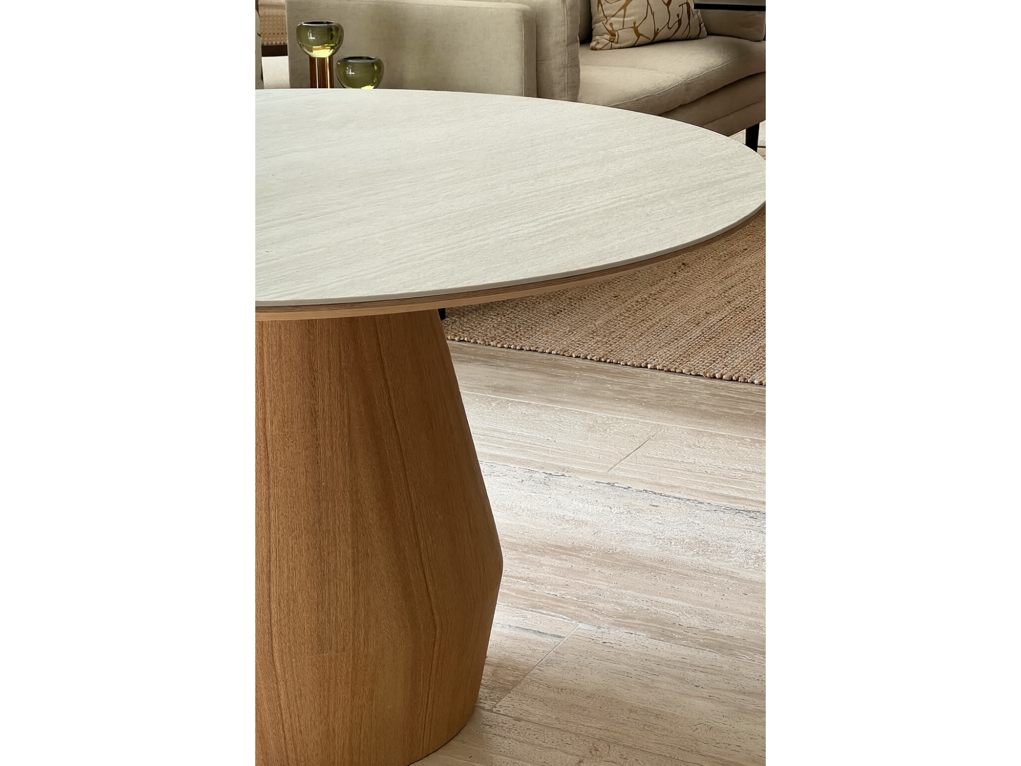 Mesa Victoria es un comedor redondo que combina un tablero cerámico con ligera textura rugosa y base en madera de fresno natural. Su base cónica abre y cierra al llegar al suelo, luciendo su cubierta con acabado similar a mármol travertino, entrando a tu espacio como un elemento que transmite tranquilidad y naturalidad.
