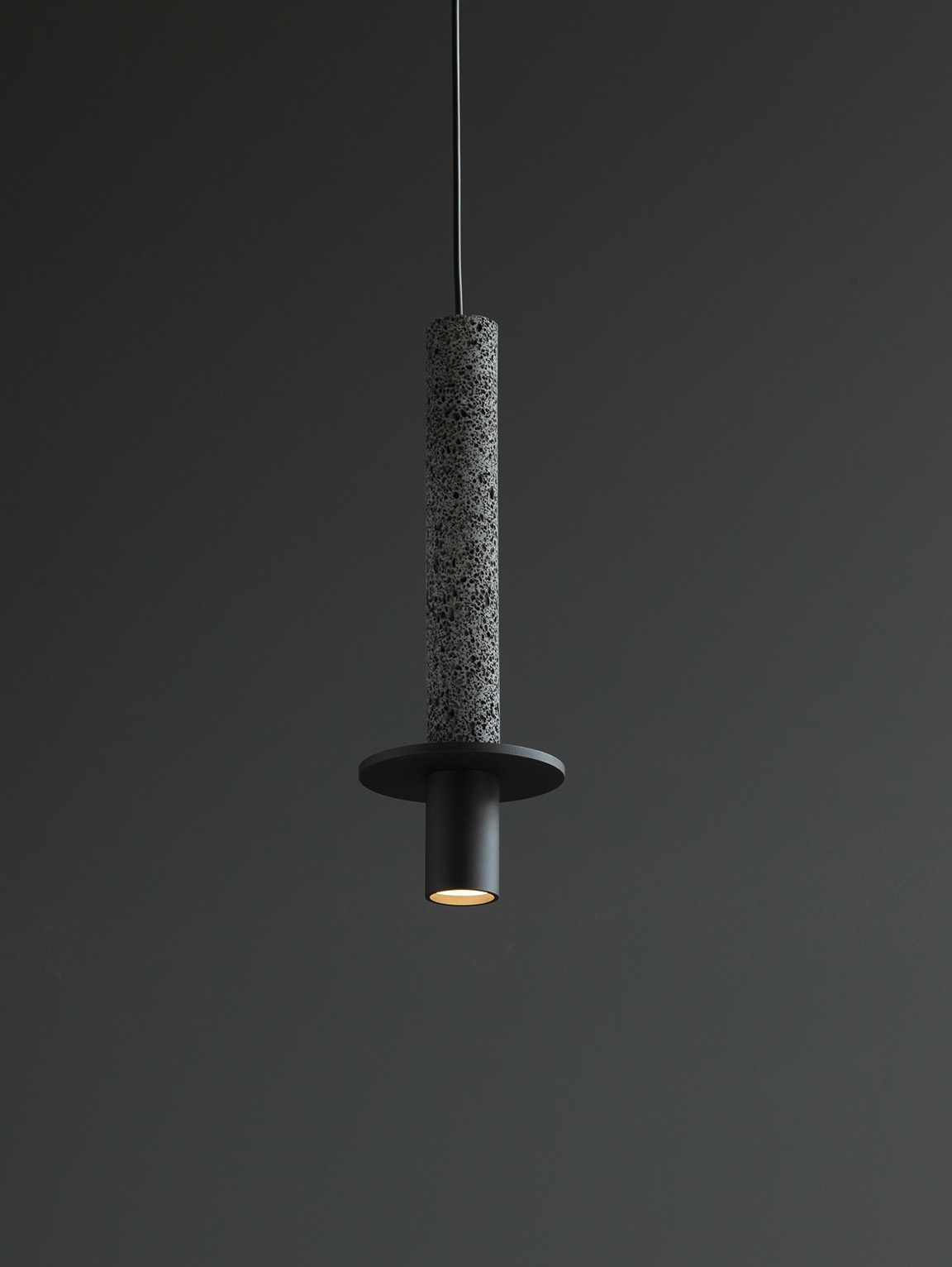 Materiales piedra volcánica y aluminio pintado. Diseñada por Studio David pompa. Medidas 32cm de largo x 11cm de diámetro. Peso 0.8kg