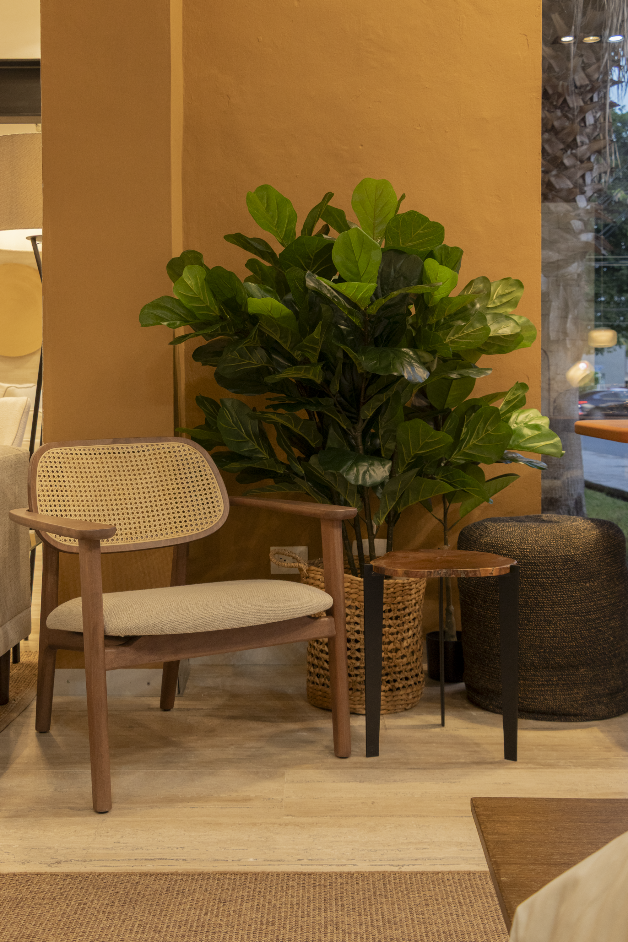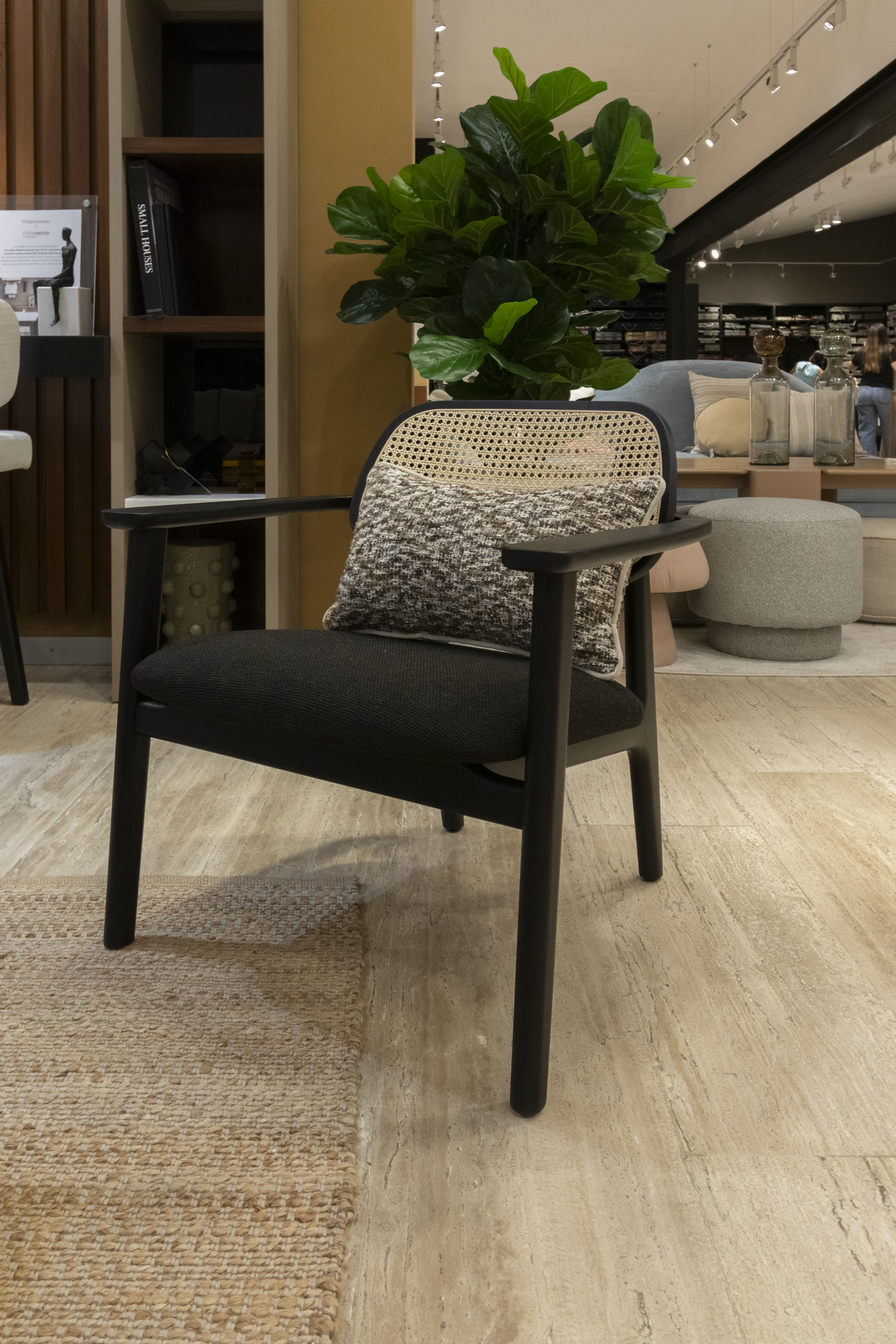 La silla de salón Titus tiene un asiento profundo y cómodo y un respaldo de ratán tejido. La luz y el aire pueden fluir a través de la superficie de caña, proyectando una sombra de patrones finos en la habitación.